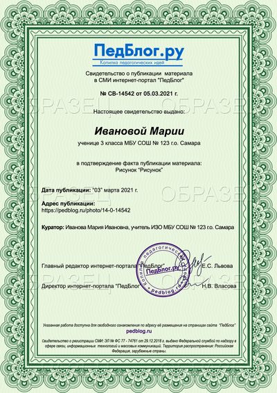 Свидетельство о публикации материала - 100 рублей. Свидетельство выдается автору работы, т.е. если автор работы - ребенок, то документ будет выдан на имя ребенка. Если автор работы - взрослый, документ оформляется на имя этого взрослого.