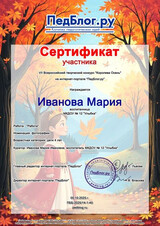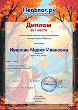 • Свидетельство о публикации материала - 95 рублейСвидетельство выдается автору работы, т.е. если автор работы - ребенок, то документ будет выдан на имя ребенка. Если автор работы - взрослый, документ оформляется на имя этого взрослого.
