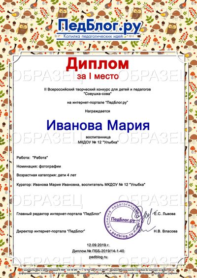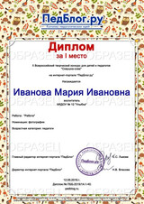 Свидетельство о публикации материала - 100 рублей. Свидетельство выдается автору работы, т.е. если автор работы - ребенок, то документ будет выдан на имя ребенка. Если автор работы - взрослый, документ оформляется на имя этого взрослого.