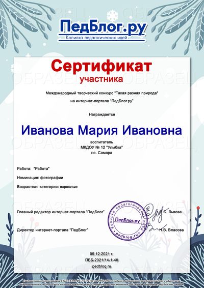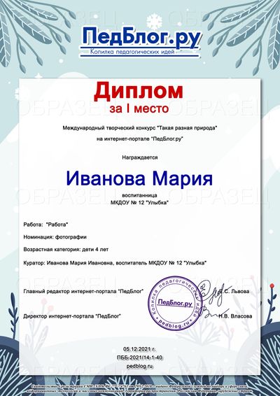 При добавлении работы на конкурс внимательно и правильно вносите свои данные во все необходимые поля. Именно то, что вы напишете при добавлении фотографии, и будет отражено в ваших дипломах. Заявки НЕЛЬЗЯ заполнять одними ЗАГЛАВНЫМИ БУКВАМИ. Перед отправлением фотографии конкурсной работы на сайт обязательно проверьте каждую букву и цифру в заявке (образец заполнения находится прямо на странице заявки). Все повторные исправления - после повторной оплаты.