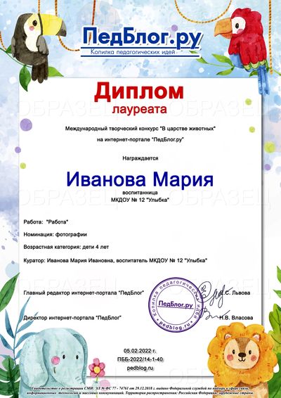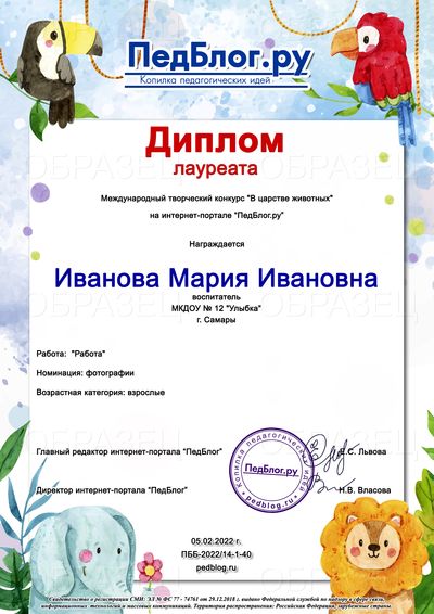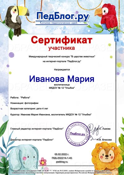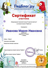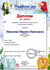 Свидетельство о публикации материала - 100 рублей. Свидетельство выдается автору работы, т.е. если автор работы - ребенок, то документ будет выдан на имя ребенка. Если автор работы - взрослый, документ оформляется на имя этого взрослого.