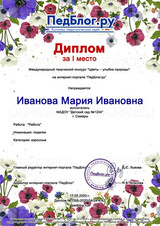 Свидетельство о публикации материала - 100 рублей. Свидетельство выдается автору работы, т.е. если автор работы - ребенок, то документ будет выдан на имя ребенка. Если автор работы - взрослый, документ оформляется на имя этого взрослого.