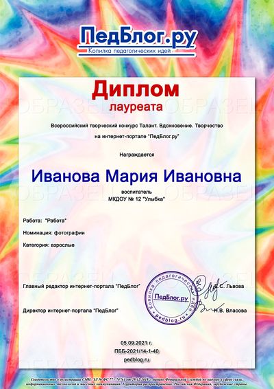 При добавлении работы на конкурс внимательно и правильно вносите свои данные во все необходимые поля. Именно то, что вы напишете при добавлении фотографии, и будет отражено в ваших дипломах. Заявки НЕЛЬЗЯ заполнять одними ЗАГЛАВНЫМИ БУКВАМИ. Перед отправлением фотографии конкурсной работы на сайт обязательно проверьте каждую букву и цифру в заявке (образец заполнения находится прямо на странице заявки). Все повторные исправления - после повторной оплаты.