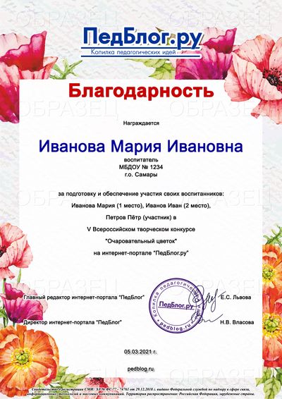 * Благодарственное письмо педагогу, заявившему 15 и более детских работ в один день, оформляется бесплатно в электронном виде!Участвуйте группами!