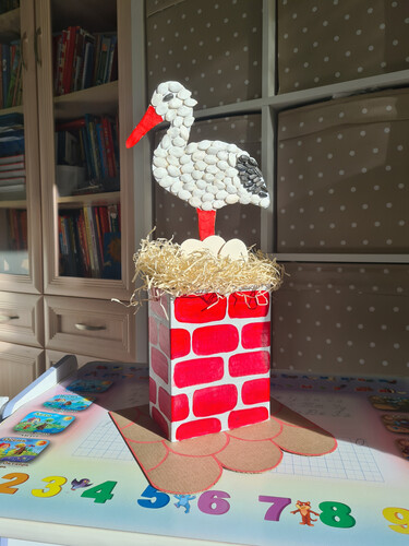 Выполнено с помощью бумаги, картона, тыквенных и подсолнечных семечек, пластилина