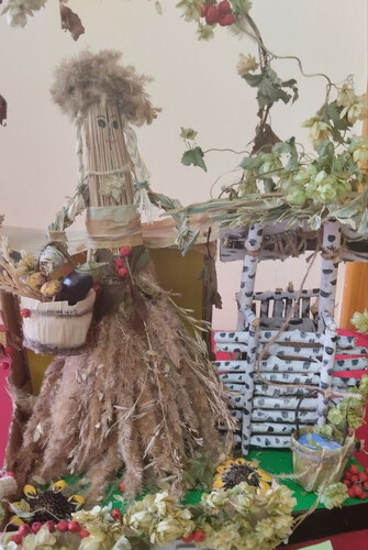 Подделка сделана из травы "Маятник", корзина листьев камыша, колодец из веток березы, украсили хмелем.