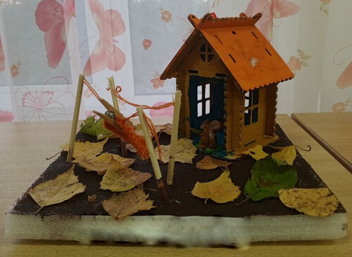 Работа выполнена из палочек для мороженного, листьев, картона и ниток