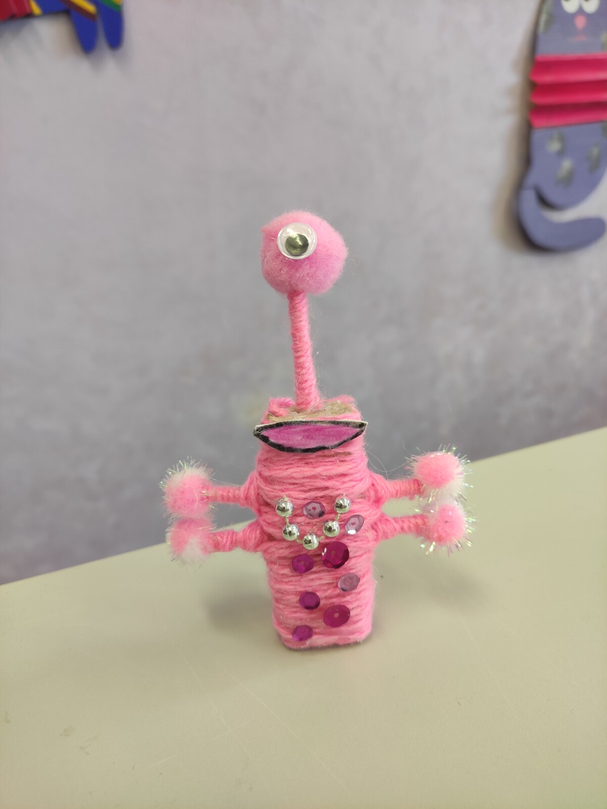 Работа выполнена из деревянной заготовки, ниток, палочки для шашлыка и цветного помпона