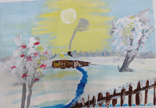Деревянный домик на фоне зимнего пейзажа