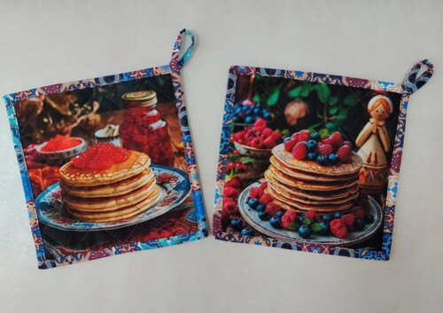 Прихватки "Масленица" выполнены из двух слоев ткани с прослойкой утеплителем, простеганы, обшиты косой бейкой.