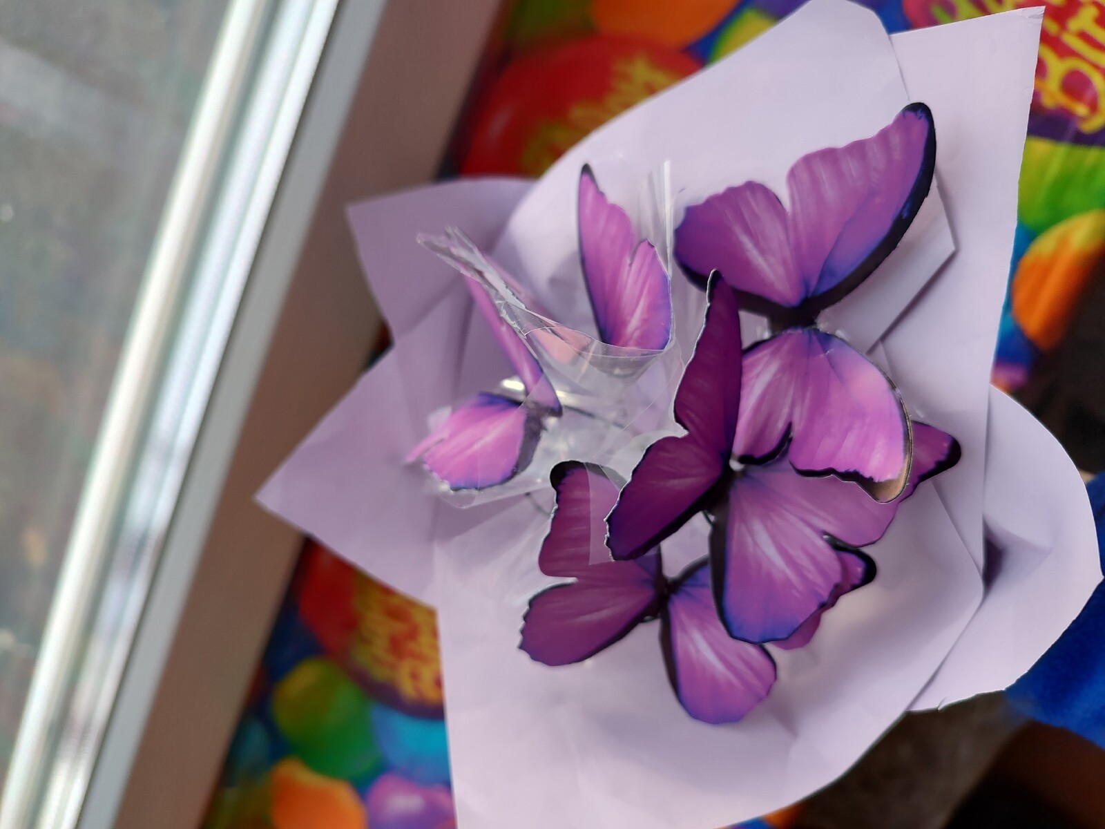 Работа выполнена из цветной бумаги и декоративных бабочек