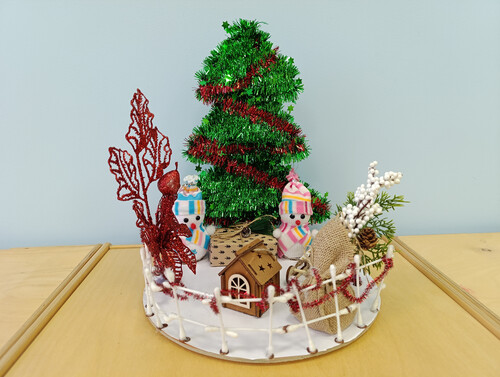 Работа выполнена из дерева, пенопласта, ватных палочек, мишуры, ткани.